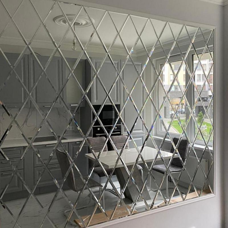 Использована квадратная серебристая зеркальная плитка размером 18х18.